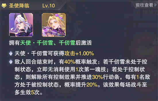 1、首先是可以在1回合或2回合便通关的极速阵容,其输出的核心是老版本千仞雪,其中输出逻辑维依靠千仞雪的羁绊关系【圣使降临】,其中写明了敌人回合结束时,老版本千仞雪有40%的几率触发无消耗使用1技能攻击敌方(前提是千仞雪不在控制状态),所以大家的千仞雪练度足够的话是可以在1-2回合便便将敌人给反击掉的,另外特别提醒,这个打法不需要我们拿一速,请让敌人先动。