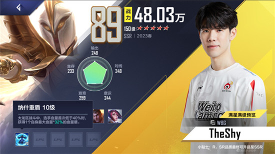 下面是23春的Shy哥89的评分,Shy哥的五维属性是不错的,但是技能相较于呼吸哥就显得比较拉胯了,他比世界的369要强一些也是属于第一梯队。