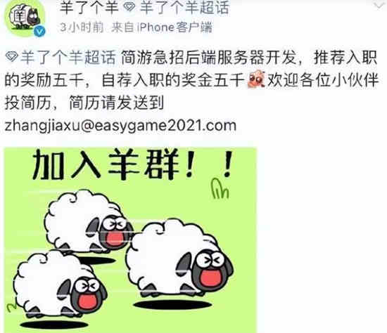 由于游戏火爆程度超预期,目前《羊了个羊》官方已经开始急招后端服务器开发。官方称“推荐入职的奖励五千,自荐入职的奖金五千”。