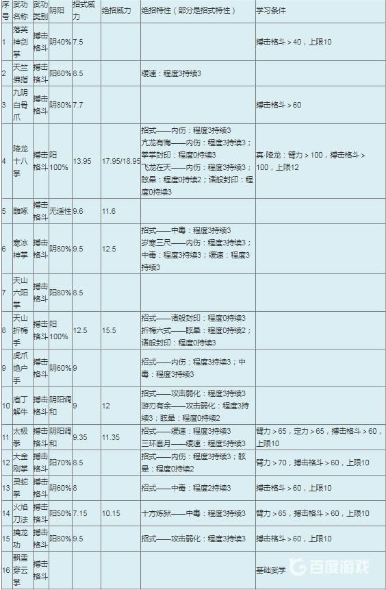 其中的每个武功都是有着不同的类别的,我接下来所说的武功也将按照其类别去进行归纳讲解哦。这里我们先重点的来说说搏击格斗类型的武学 ,第一个是落英的神剑掌法,这套武学需要我们的格斗大于四十的。然后是经典的九阴的白骨爪,这个是需要我们格斗的数值达到六十以上的;其中的降龙掌就需要我们的臂力与格斗都大于一百的,这个招式是有着内伤的特殊效果的,其效果还根据所命中的层数而产生不同程度的伤害的哦;太极拳法是需要我们的臂力以及定力达到六十五,而格斗数值就只需要大于六十即可,这个招式也是有着特殊的招式效果,它可以让敌人有着一个缓慢的不良状态的;还有大金刚的掌法,这个是需要我们的臂力大于七十的,然后格斗数值大于六十,这个如果命中了敌人同样会产生内伤的效果,并且有着三个不同的程度哦;灵蛇的拳法就只需格斗数值大于六十,这个灵蛇则是可以给予敌人一个中毒的效果;擒龙的功法也是只需要格斗的数值达到六十以上的。