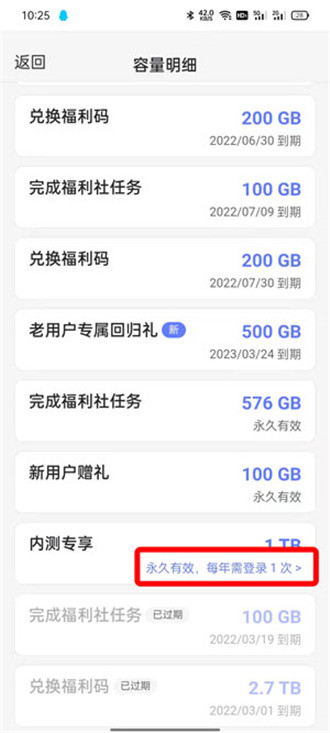5、需要注意的是,如果你是此前参加过内测、公测的用户,那么需要注意获得的内测专享容量,需要每年登录一次才可以在第二年继续享用。