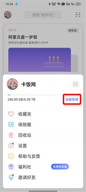 2、然后点击出现菜单窗口中的【容量管理】,查看你的当前容量;