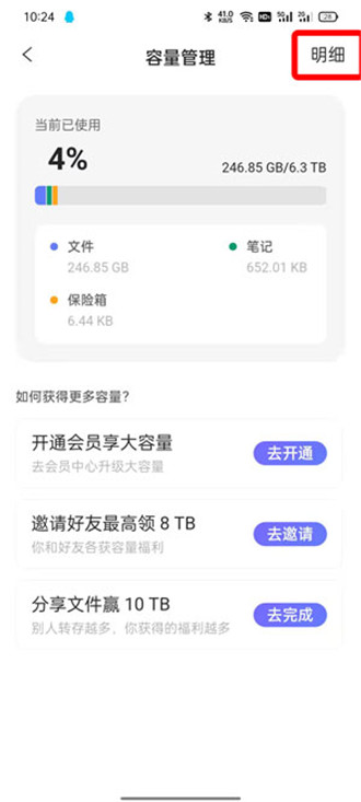4、通过明细查看所有容量的获取方式、时间等,通过下方的【永久有效】查看自己的永久容量;