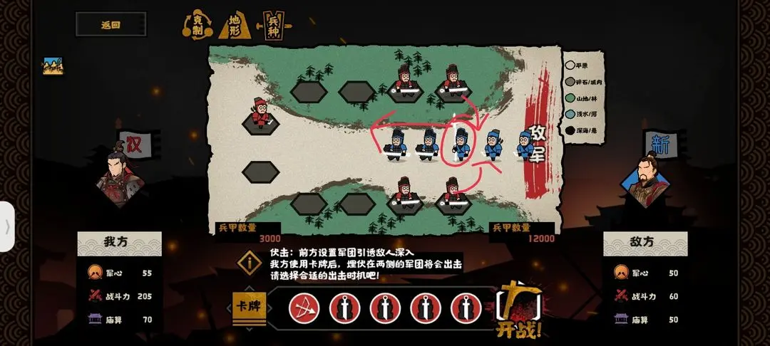 我们前期先把骑兵往上拉这样的话王莽的军队就会被吸引这样的话他就会往上走而下方有一个洞我们立刻往下拉通过那个洞就可以胜利了是不是非常简单呢?