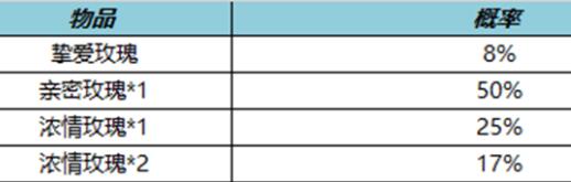 购买红蓝对决(1日),可额外随机获得以下之一:挚爱玫瑰*1、亲密玫瑰*1、浓情玫瑰*1、浓情玫瑰*2。累计20次至少可获得挚爱玫瑰*1。