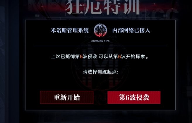 5、在成功抵御第5、10、15波侵袭后,将对该阶段的禁闭者当前生命值、能量状态及已选狂厄波动进行存档。若在未通关后续波次时结束挑战,可选择从存档点继续或重新开始特训,选择重新开始后,上一存档点将被清除。