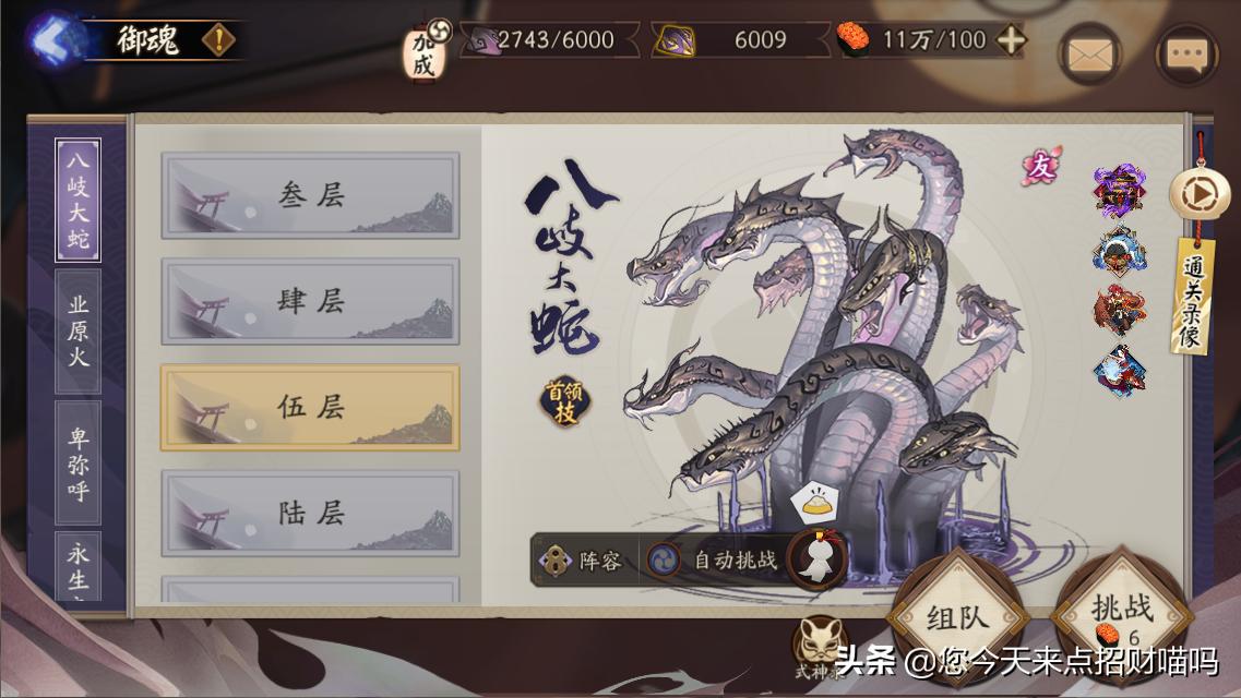 御魂5层的最后一层,八岐大蛇携带两只孟婆。