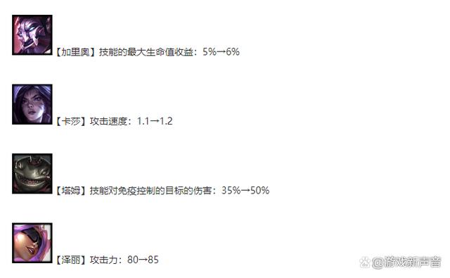 泽丽是狙神,但伤害手段主要是魔法的,攻击力提升五点并没有什么影响,塔姆提升了对巨像的伤害,算是对牛头,大虫子,加里奥有了一定的反制手段,总体而言,五费卡的调整不影响大的局势。