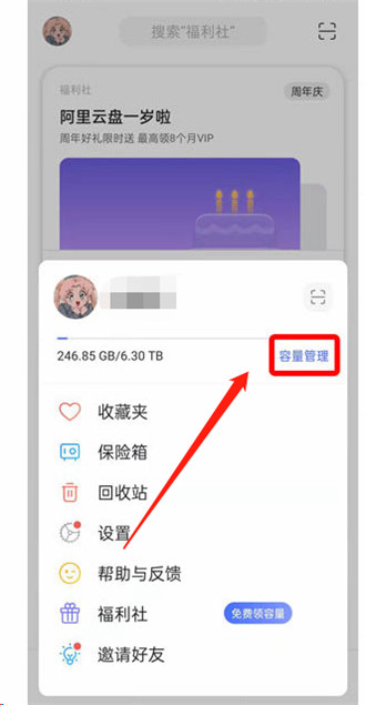 2、这时会出现许多功能菜单,头像下方就会显示大家的容量,点击右侧的容量管理(如图所示)。