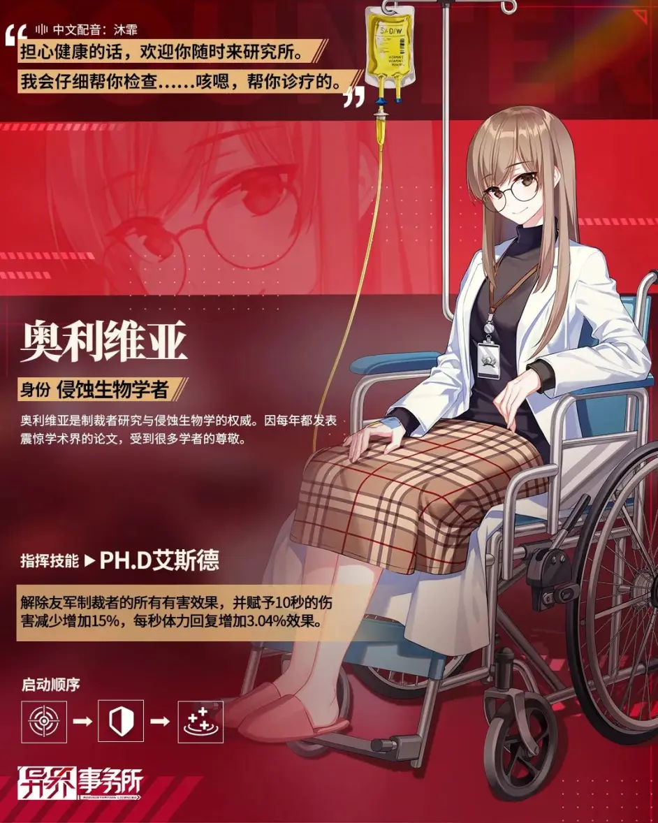 我们小编分享的异界事务所奥利维亚技能介绍-异界事务所奥利维亚分析。今天带来了异界事务所奥利维亚技能介绍,异界事务所在此次维修后会复刻机务员SSR——奥利维亚。这个角色在生物上有很大的天赋。让很多小伙伴对她好奇,让小编介绍她的技能吧,希望异界事务所奥利维亚分析这个攻略对大家有所帮助!
