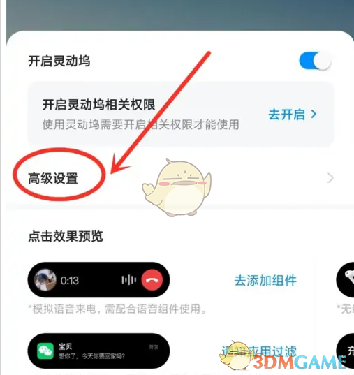 2、进入灵动坞设置界面,点击“高级设置”选项。