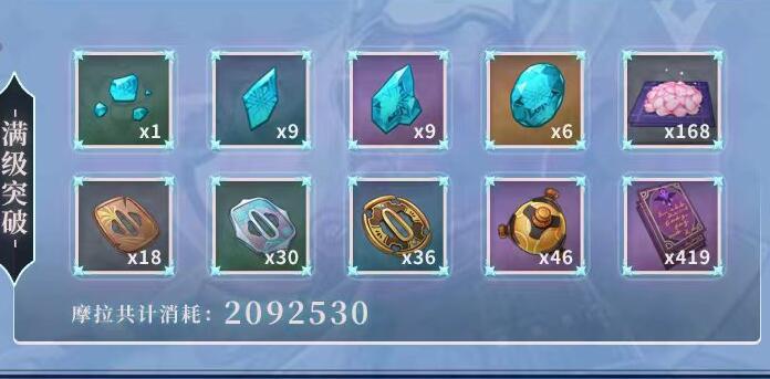 等级阶段升级所需的费用归总:摩拉*209万,大英雄的经验*419。