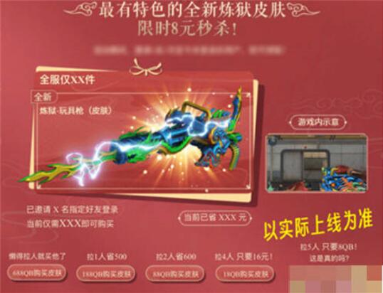 4:同时还有八元秒杀的活动,炼狱玩具枪皮肤邀请五人就可以用八块的价格拿下这个皮肤,但是邀请人的任务还是比较难做的。
