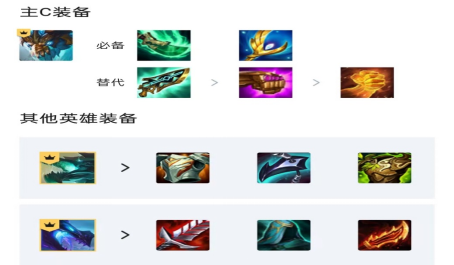 艾达丝多余的位置可以有大魔抗和狂徒之铠装备用来备选,剩下的增益装备例如能量杯或者是攻速旗之类的可以让巴德来携带同时进场一定要拿风暴大剑。