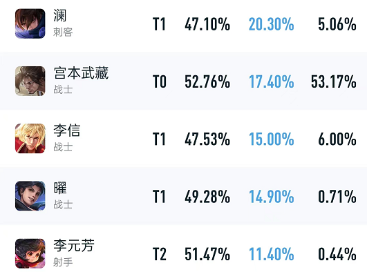 打野:澜—20.3%、宫本武藏—17.4%、李信—15%、曜—14.9%、李元芳—11.4%