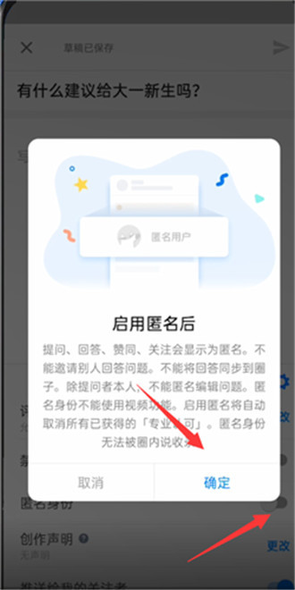 3、接着在匿名身份右侧的滑块向右滑动,弹窗会提示启用匿名后提问、回答、赞同、关注会显示为匿名,点击确定;