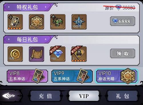 VIP3:充值1000钻石(100元),获得50个5系碎片自选、5个奇迹券、400万金币。