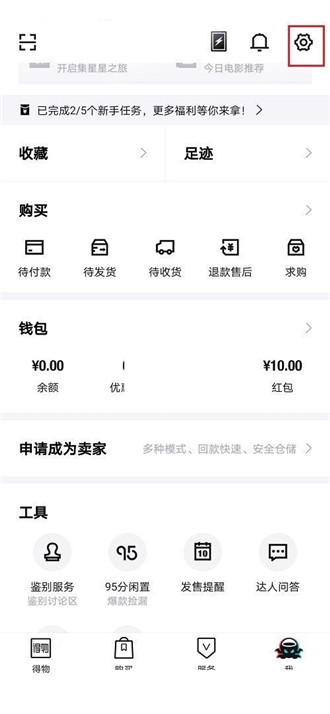 2、然后进去得物个人中心之后,点击“设置”图标;