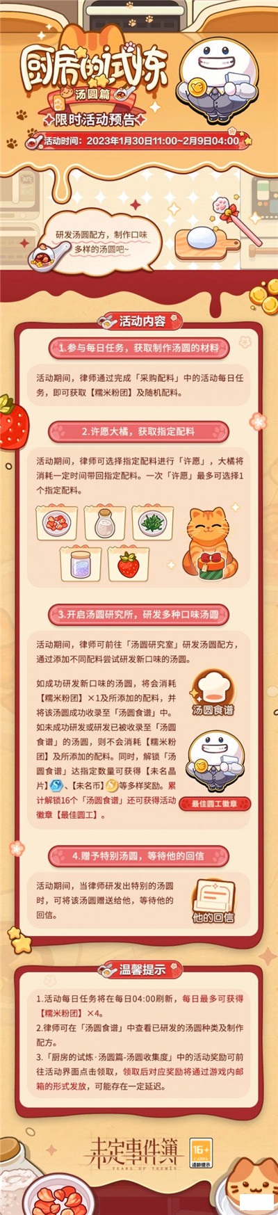 本文介绍未定事件簿汤圆配方是什么?最近也是即将迎来元宵节节日,很多游戏也是在游戏中开启了很多相关的各种活动让大家来进行参与!其中未定事件簿这款游戏也是开启了厨房的试炼活动,在活动这一个活动中有着非常多的食谱美食可以让大家来进行制作,而且不同的美食也都有相应的配方让大家让大家来进行查看!其中未定事件簿汤圆配方是什么相信应该也有一些小伙伴不是非常清楚!在这里小编也是为大家准备了未定事件簿汤圆汤圆食谱一览,有不知道的小伙伴也可以一起过来看一看了解一下!