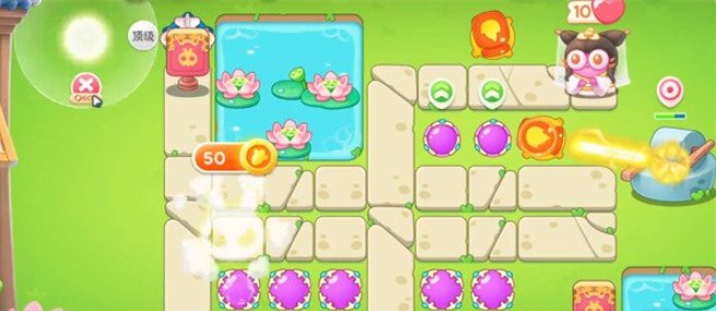 开局在如图所示的位置放置两个魔法球,其中左边的魔法球我们给升至满级,这样可以在对兔子造成伤害的同时也能清理下方的障碍物