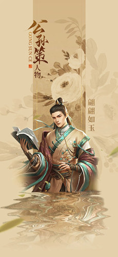 公孙策本次以京城才子身份出场,身穿卡其色底传统衣袍,外罩暗紫色大麾,发髻整洁,手捧书本,一种文人雅士气息拂面而来。