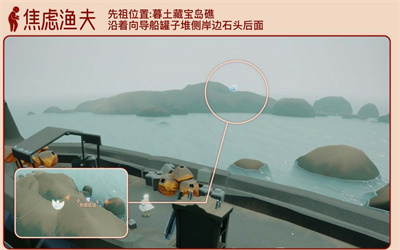 1、焦虑渔夫,墓土宝藏礁,向导先祖小船的后方浅滩上;奖励0.5白蜡烛;