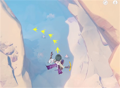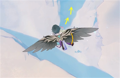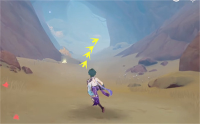 2、跳下去之后,根据如下图所示的黄色箭头指示路线图飞行一直向前即可找到沙虫隧道;
