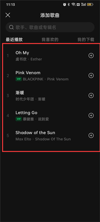 5.最后在添加歌曲的页面中点击你要添加的歌曲即可;