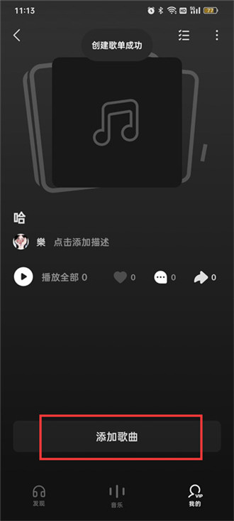 4.点击过后就创建成功了,在创建的歌单页面中点击【添加歌曲】;