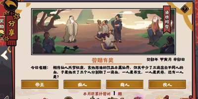在无悔华夏中,渔樵问答2月2日题目来了,只要回答对了里面的各种问题才可以得到奖励,今天的题目是:相传仙人托梦杜康,言他想造的饮品本属仙畀,但其中少了三滴出自不同人的血,于是他找了三个人分别取了一滴血,一人是书生,一人是武将,还有一人是?下面来和小编一起看看吧。