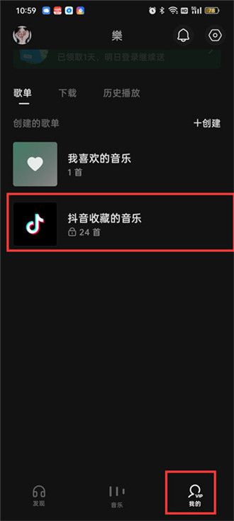 2.登录成功之后点击右下角【我的】来到我的页面中就可以看到抖音中的歌曲了;