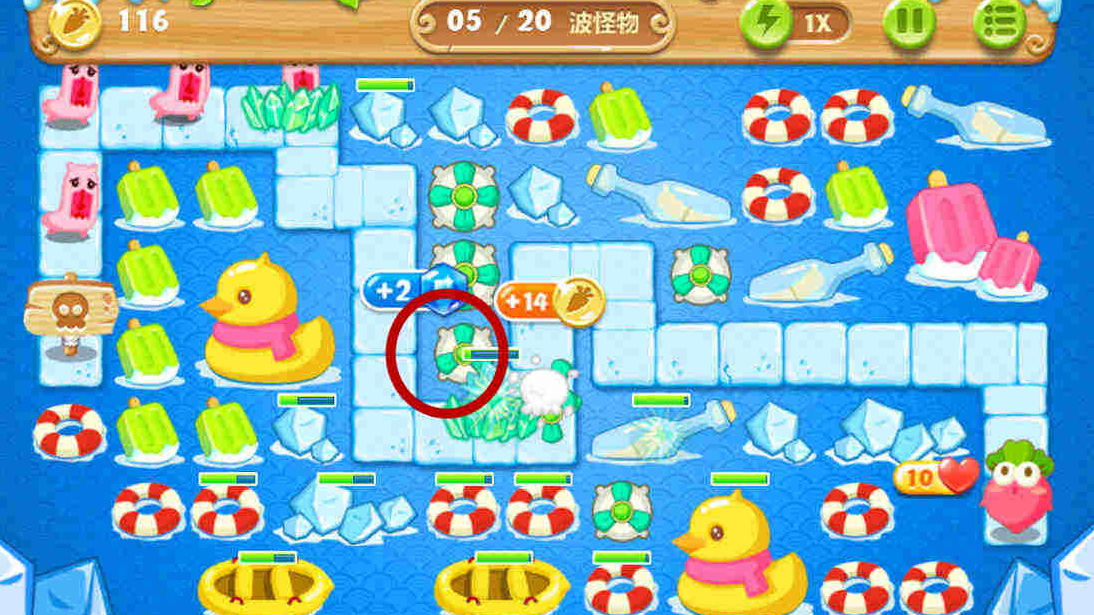 之后我们手动用一下,把左边的那些炮全部优先把那些小鸭子给都拆了,因为刚开始就输出效率方面不是很够,这个时候打鸭子花的时间很久而且很容易把刚开始的零散小怪给漏过去。鸭子在拆了之后能够直接爆出来四个章鱼,后续大部分的钱全部都用于这几个鸭子的升级上面就可以,这个时候基本上说是完全体都没有什么问题,基本上随便哪一波的怪来都是直接打死。