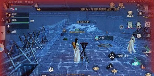 来到这里的第一件事并不是寻找我们需要的物品,而是搭起篝火保证自己角色不被冻死这里我们在来之前就需要提前准备好荧光火石和胡辣汤,火石可以配合木屑升起篝火,在篝火的附近我们角色的寒冷值会慢慢恢复,胡辣汤也差不多,相对来说比较鸡肋,只能够保持当前的体温,也就是说只有在接近满温度的时候时候用效比较好,不然的话就不能充分发挥它的作用,前面提到的这两个道具都是可以通过暗器大师任务获得。剩下的就是保证自己角色安全的情况下去采集我们需要的材料了。