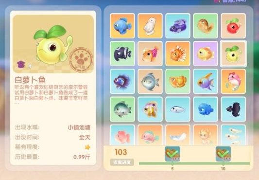 我们小编分享的摩尔庄园钓到白萝卜鱼方法教程-摩尔庄园钓到白萝卜鱼方法攻略。今天带来了摩尔庄园钓到白萝卜鱼方法教程,摩尔庄园白萝卜鱼是游戏中新出现的品种,玩家需要钓鱼,问题是很多玩家不太能掌握出现的时间和地点。所以小编整理了摩尔庄园钓到白萝卜鱼方法攻略,想钓鱼的快来看看,希望能完成任务。
