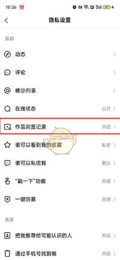 4、在隐私设置的页面中点击【作品浏览记录】;