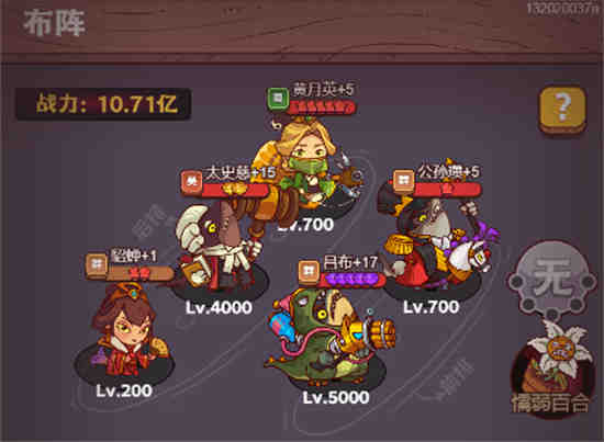 13关是贾诩,大家用最上面的通用阵容即可,只要把阵容中的貂蝉血量调高一些,让她慢点被BOSS打死,基本是没有难度的。
