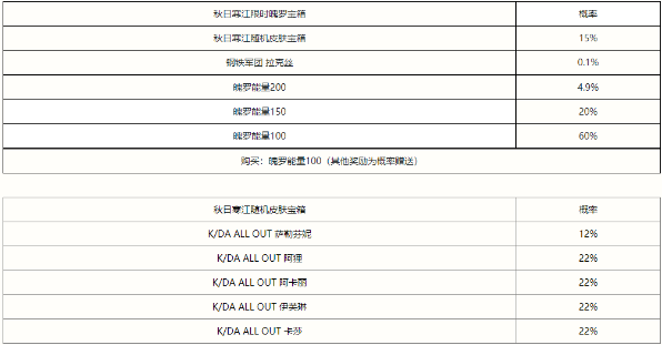 《英雄联盟手游》秋日寒江限时魄罗宝箱,将于2022年10月7日00:00,正式上架商城。秋日寒江限时魄罗宝箱,10次至少掉落1个秋日寒江随机皮肤宝箱或钢铁军团 拉克丝,秋日寒江随机皮肤宝箱包含K/DA系列皮肤,秋日寒江限时魄罗宝箱奖励抽取概率公示如下: