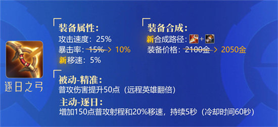 4:逐日之弓,调整合成路径,降低购买价格,然后增加装备属性移速百分之五,降低暴击率;