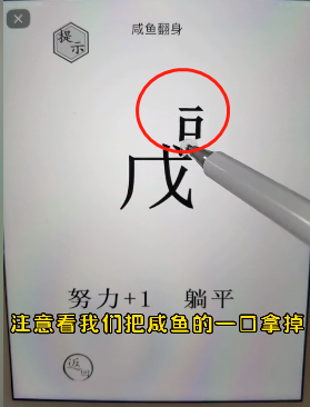 1、这一关可以看到有一个大大的【咸】字,在它的下面还有一个【努力+1】和【躺平】。