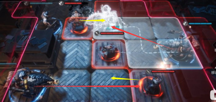 如下图所示,控制左上方的先锋骑兵,使用技能将敌方斗士向下推一格。