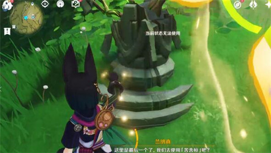 1、在任务接取地点附近有一个破碎的草元素方碑,装备小道具「苦舍桓」,对着它使用,令其修复,随后使用草元素攻击激活草元素方碑。