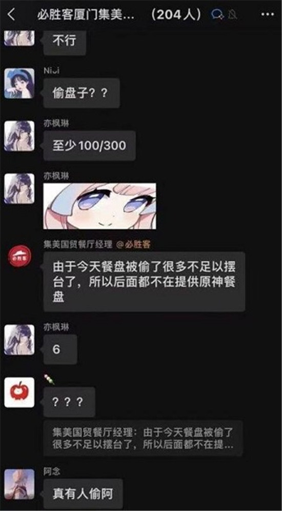 3、门店管理员吐槽:“由于今天餐盘被偷了很多不足以摆台了,所以后面都不再提供原神餐盘”。