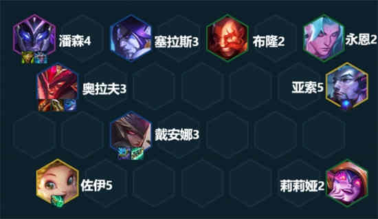 顺利的话尽快上八,大搜找出一张1星的亚索换下猴子,补充塞拉斯开2幽影2格斗,亚索则能补充输出和控制,打版本毒瘤神龙努努也能有所克制。在八级先卡利息把奥拉夫和皎月搜到3星稳定后根据场面和血量判断局势,后续如果上不去九就在八级继续提升阵容整体质量,搜3星潘森。能上九就补充2星佐伊,巴德和索拉卡也可以考虑。有屠龙转职可以给潘森下掉布隆,有狂刃转职可以考虑开6狂刃最大化奥拉夫的伤害。注意有短兵之利和万用瞄准镜时灵活调整站位。