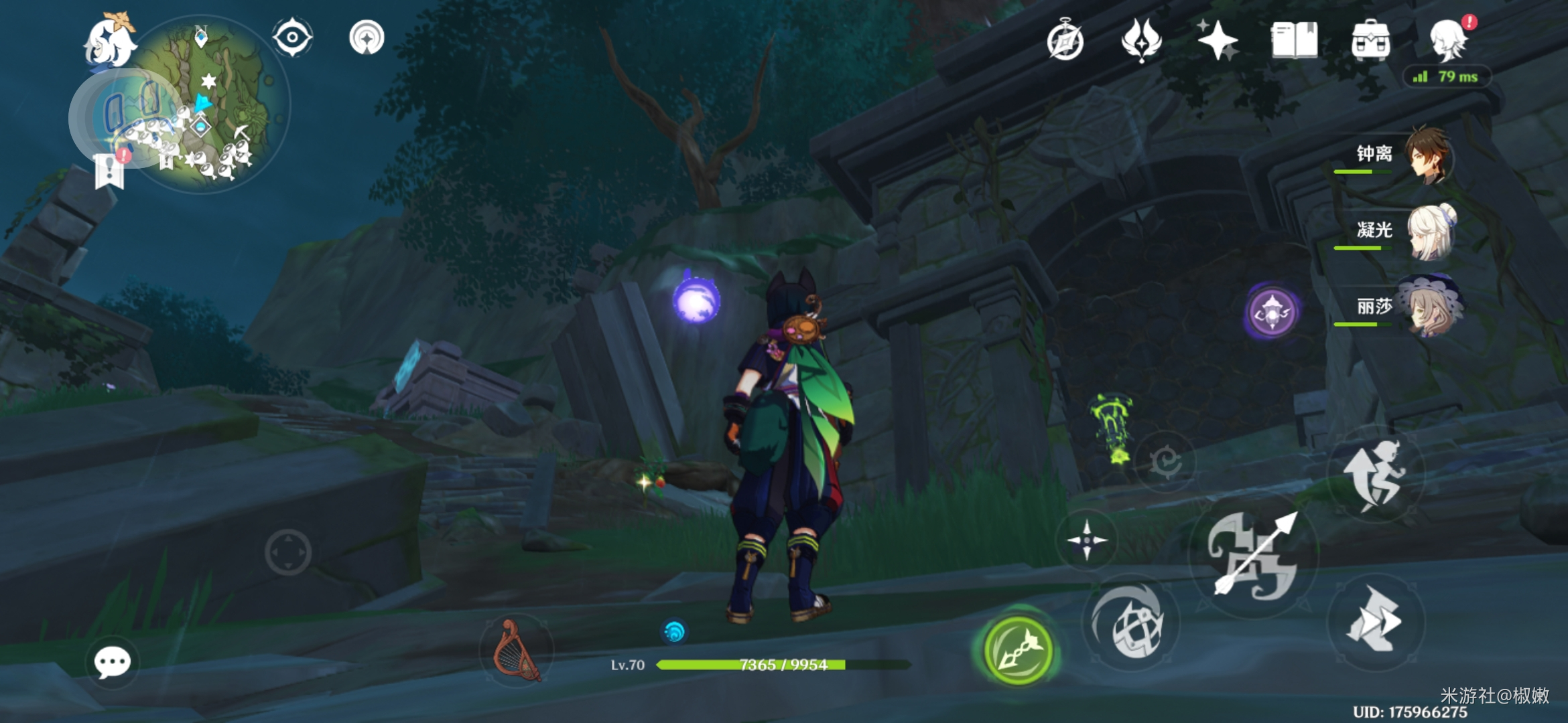 我们将从屏幕中间草种子处钻出来,飞绳索到顶楼。此时注意调整面向,背对图中右下角的灯座,往提纳里左侧方向走。