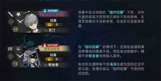 那么什么是主题特有干员呢?其实就类似于傀影肉鸽中的【暮落】,玩家在获取该干员之前,偶尔也会以“临时招募”干员形式出现,且应该像傀影肉鸽中的【暮落】一样,在水月肉鸽中有独特的天赋加成。