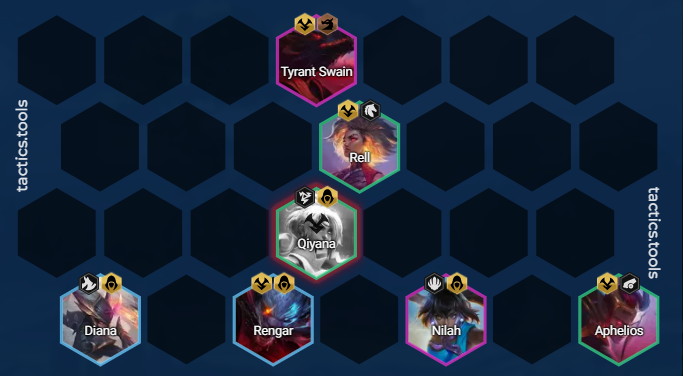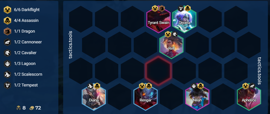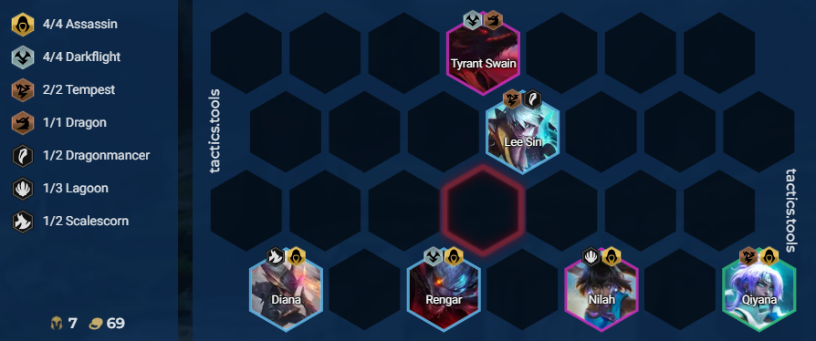 7人口龙来了。4刺4暗2雷霆,保证刺客整体的输出与黯灵龙前排的坦度,若是刺客的星级不够,可以优先将乌鸦的装备给上并献祭刺客单位,大天使的与之相性较好,能够提供不错的伤害输出,拉高斯维因整体的回复量来强化坦度,献祭的单位可为黯灵龙弈子提供生命值,提升整体的坦度。