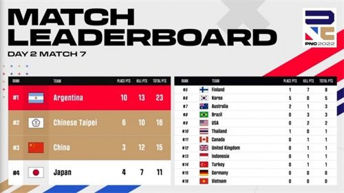 第二局比赛,地图为米拉玛。中国大陆队在四阶段的大厂房激战中,淘汰掉残编的美国队和土耳其队;五阶段,中国大陆队在房区乱战中站住地理优势,淘汰掉芬兰队后转移过程中被日本队淘汰出局。决赛圈,场上三队僵持不下,阿根廷队主动出击,先手淘汰韩国队,再接游击战术,最终淘汰中国台湾队,成功吃鸡!